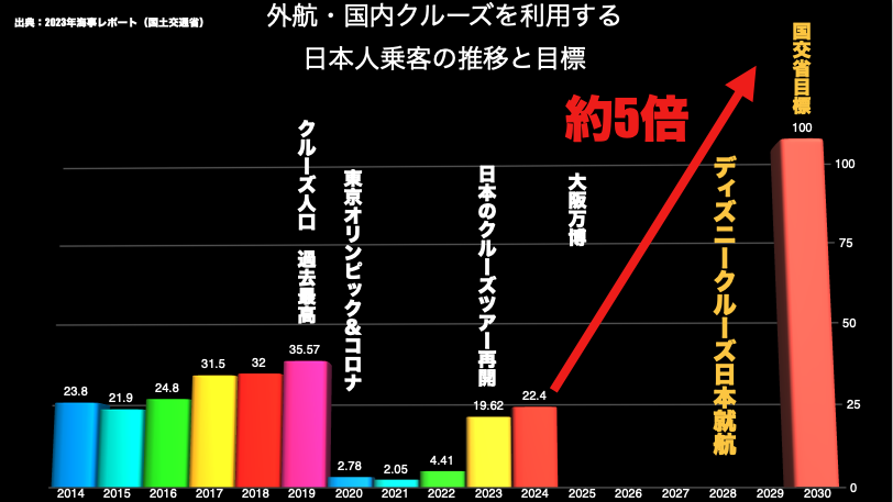 実際、国土交通省も「2030年にクルーズ人口を100万人にする」と目標値を設定しており、これは約5倍の市場拡大を見込んでいるんです。